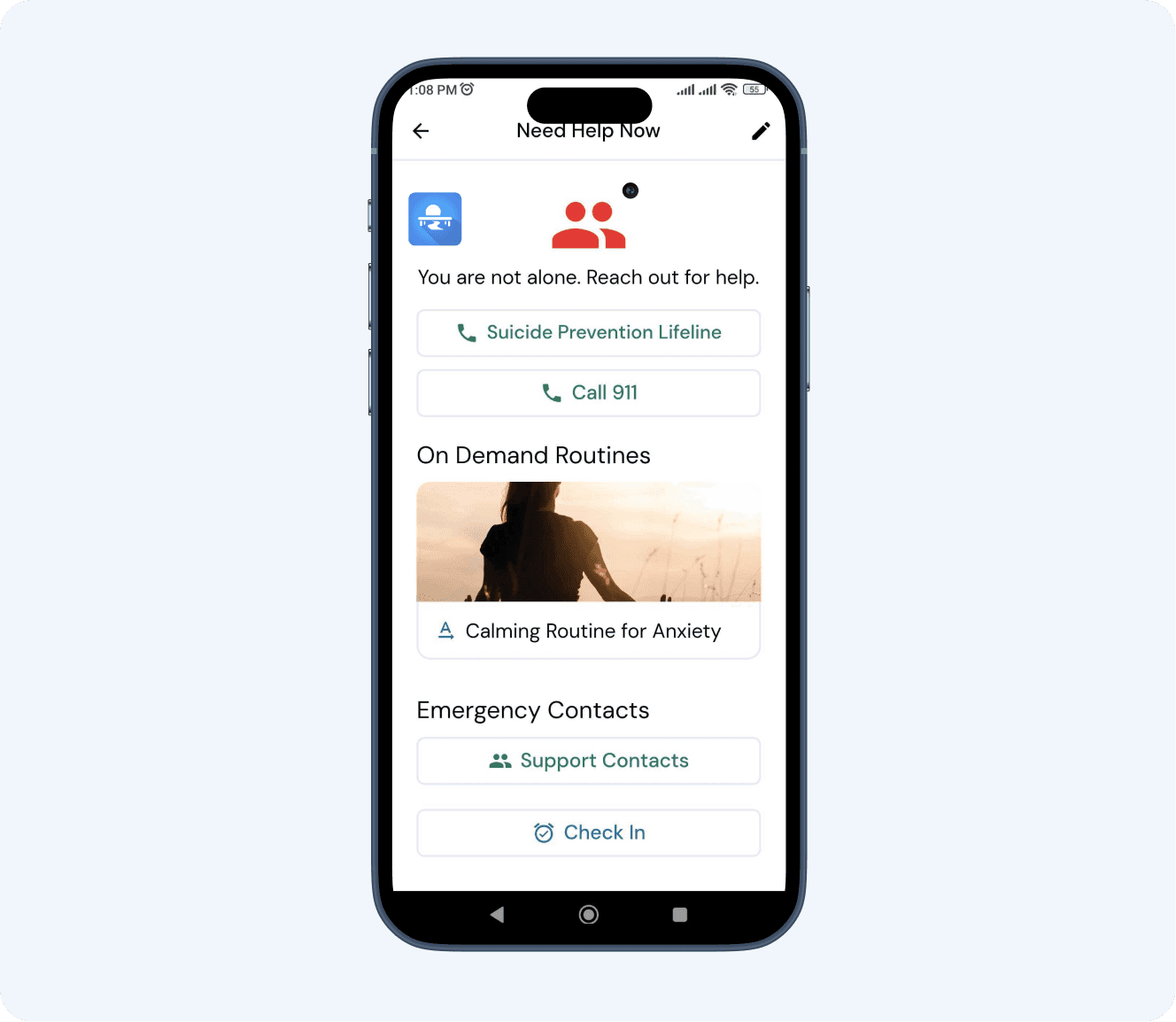 We are committed to providing real-time support to those struggling with emotional distress through our mobile app, which serves as a vital tool in preventing suicide by fostering community connection, providing easy access to emergency contacts, pre-crisis planning, providing physical and mental well-being routines and specific resource routines based on the individuals needs and preferences.